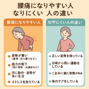 こんにちは、奈良県王寺町の「奈良王寺てらだ整体院」です。 腰痛は多くの方が悩まされる症状ですが、実は 「腰痛になりやすい人」と「なりにくい人」には、 はっきりとした特徴の違いがあります。 今回は、整体の視点からその違いを […]
